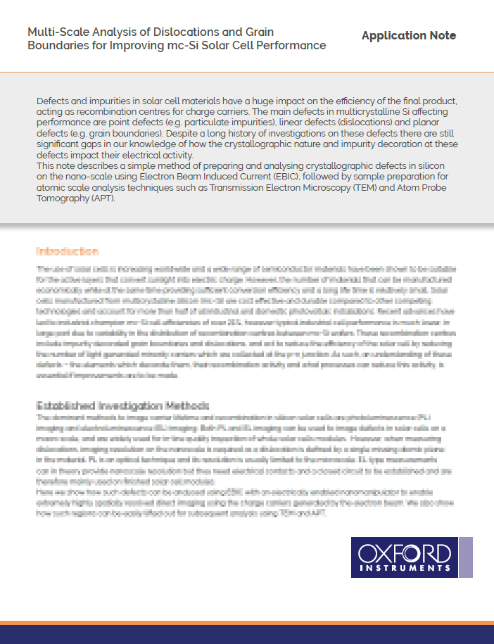 mc-Si太陽電池がその能力を最大限に発揮できるようにするためには、生産性の向上が必要です。この改善は、これらの太陽電池に見られるナノスケールの特性を理解することにかかっています。このアプリケーションノートでは、電子ビーム誘導電流(EBIC)を使用して、これらのサンプルをナノおよび原子スケールで分析する方法をレビューします。