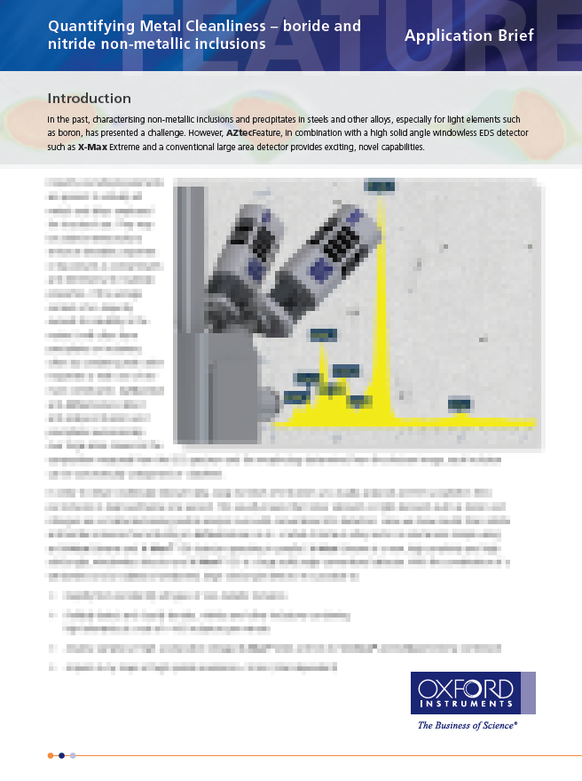 これまで鋼やその他の合金中の非金属介在物や析出物の解析、特にホウ素などの軽元素の解析は課題でした。しかし、AZtecFeatureは、X-Max Extremeのような高立体角ウィンドウレスEDS検出器や従来の大面積検出器と組み合わせることで、エキサイティングで新しい機能を提供します。
