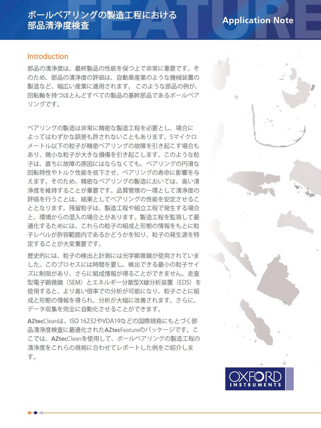 ベアリングの製造は非常に精密な製造工程を必要とし、場合によってはわずかな誤差も許されないこともあります。5マイクロメートル以下の粒子が精密ベアリングの故障を引き起こす場合もあり、微小な粒子が大きな損傷を引き起こします。このような粒子は、直ちに故障の原因にはならなくても、ベアリングの円滑な回転特性やトルク性能を低下させ、ベアリングの寿命に影響を与えます。そのため、精密なベアリングの製造においては、高い清浄度を維持することが重要です。品質管理の一環として清浄度の評価を行うことは、結果としてベアリングの性能を安定させることとなります。残留粒子は、製造工程や組立工程で発生する場合と、環境からの混入の場合とがあります。製造工程を監視して最適化するためには、これらの粒子の組成と形態の情報をもとに粒子レベルが許容範囲内であるかどうかを知り、粒子の発生源を特定することが大変重要です。