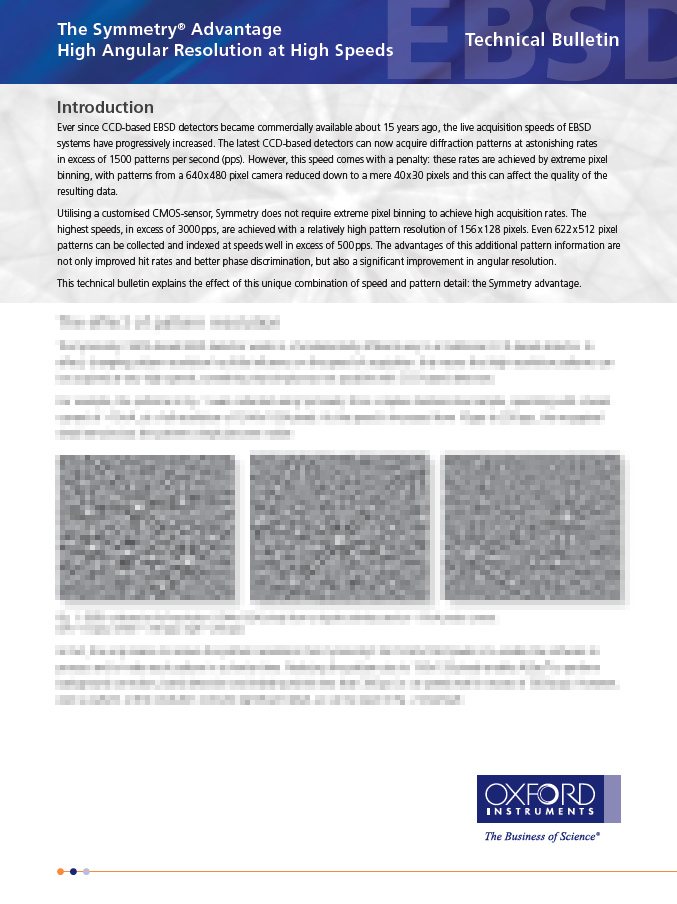 約15年前にCCDベースのEBSD検出器が市販されて以来、EBSDシステムのデータ収集速度は徐々に向上してきました。最新のCCDベースの検出器は、毎秒1500パターン(pps)を超える驚異的な速度で回折パターンを取得できるようになりました。 しかしこのスピードには注意点があります。:これらのレートは、640 x 480 ピクセルのカメラからのパターンをわずか 40 x 30 ピクセルに縮小した極端なピクセルビニングによって達成されますが、これは結果として得られるデータの品質に影響を与える可能性があります。