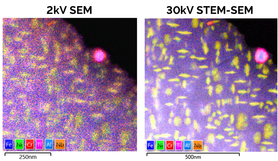 低電圧EDSとSTEM-SEMで取得したNi超合金サンプルの高分解能EDSマップ(下図)を比較すると、どちらの手法でも20nm以下の対象が容易に観察できます。しかしこの材料の場合、STEM-SEMモードでは大幅な分解能の向上が見られます。