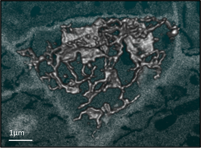 図 2. 根の細胞の端にある小胞体を3次元的に再構成したSBFSEMデータ。図1に示したのと同じ標本から撮影したデータ。