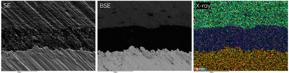 図 3. 形状を示す二次電子(SE)画像、密度の違いを示す後方散乱電子(BSE)画像、および骨インプラント内の元素分布を示すX線信号の違いを示したもの(サンプル提供:Zhidao Xia, Swansea University)。