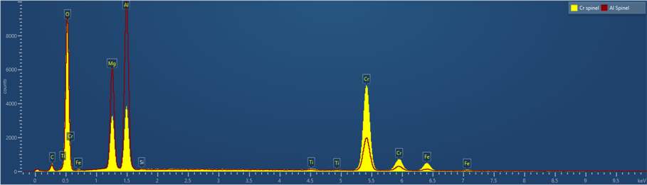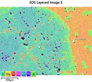 私はしばしば、さまざまな組成のスピネルを大量に含むスラグサンプルを使用します。スピネルは、その組成が予測可能なので優れています。それらはAB2X4の式で表され、Aは2価の陽イオン(鉄、マグネシウム、マンガン、亜鉛など)、Bは3価の陽イオン(クロム、アルミニウムなど)、Xは酸素です。これは原子数%で酸素が57.1%、Mg+Feが14.3%、Al+Crが28.6%であることを意味します。この情報があれば、このサンプルをどのようなシステムにも持ち込むことができ、この種の材料を正確に分析する能力をチェックすることができるので、鉱物、セラミック、鋼の介在物などの分析に高い信頼性を得ることができます。