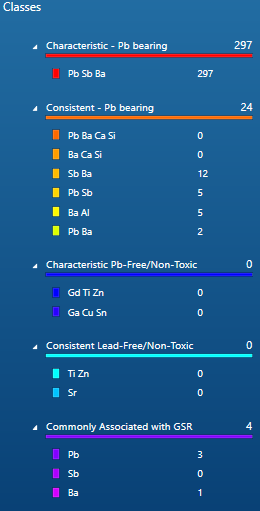各粒子の正確で定量化された組成が得られれば、規格の内容に基づいて一連の数値基準を設定することで、各粒子を分類することができます。  これらの基準は通常、個々の元素に関するもので、例えば「Pbはパーセントでxとyの間で検出されなければならない」というものです。  そして複数の基準を組み合わせてクラスを作ることができます。  このようにして、規格で定義されたルールを実装するクラスのコレクションを構築することができます。
