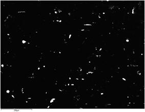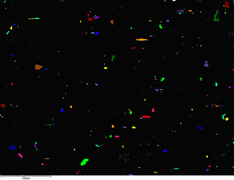粒子は識別され、単一のグレーのしきい値によって暗い背景から分離されました。 この情報をもとに、EDSの測定を行うべき場所を決定されます。 この閾値に該当するすべての粒子の形態が自動的に測定され、その後のEDS分析による組成データと瞬時に結合されます。 図2は、多数の粒子が検出された視野の例です。