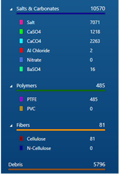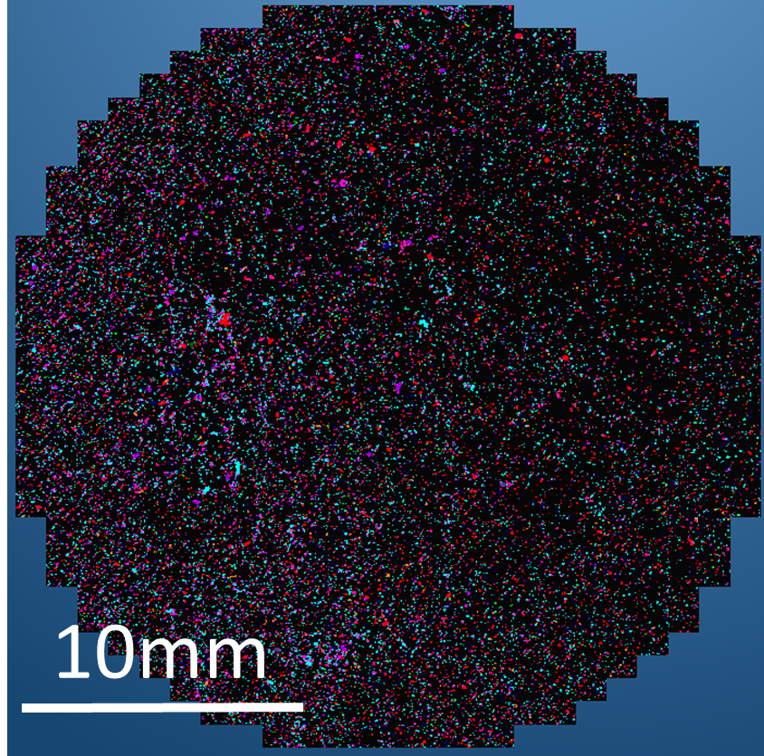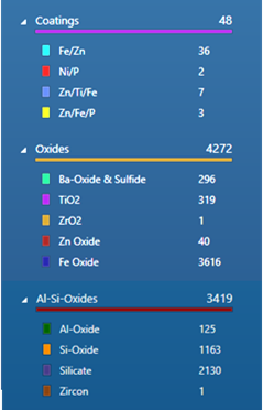 通常、フィルターの全体を自動的に分析し、すべての粒子を確実に検出します。 図3は506mm2を超える全周の画像をモンタージュしたものです。 31249個の粒子がリアルタイムで検出、分析、分類されました。 図4に示すように、粒子はその分類によって色分けされています。