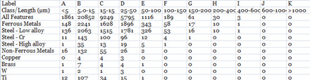 表 1: ISO16232およびVDA19で定義されたサイズビンに報告されたこのサンプルの技術的清浄度の結果のサブセ