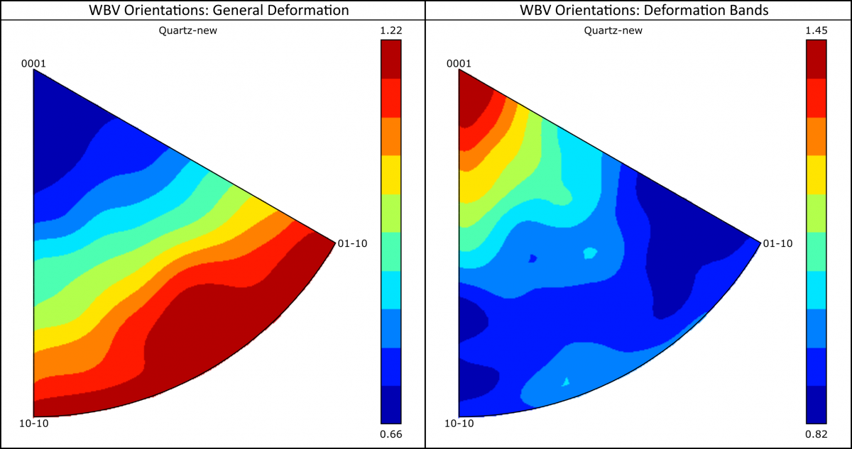 結晶座標系でのバーガースベクトルの向きを示す逆極点図。 左 – 石英粒内の一般的な変形の領域で、基底面に横たわるバーガースベクトルを示しています。 右 – 狭い平行な変形バンドで、<c>方向に近いところに集まったバーガースベクトルを示しています。