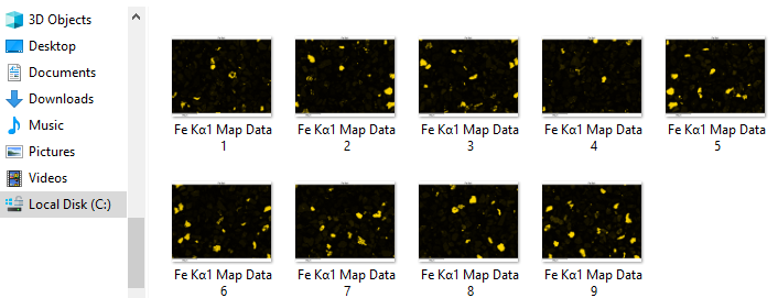エクスポートが完了すると、エクスポート先のフォルダに元素フォルダが作成されているのがわかります。Feフォルダの中を見ると、すべての分析領域の鉄(Fe)マップが表示されています。