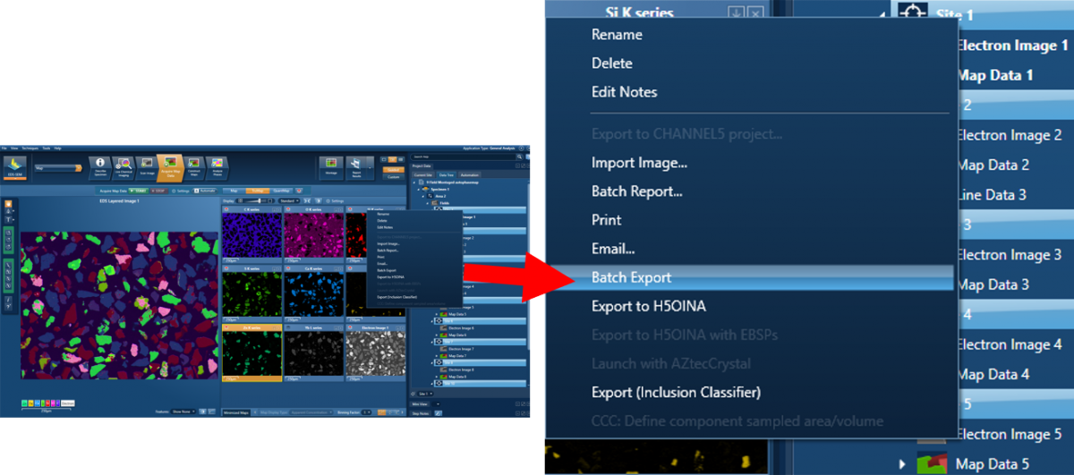 レポート出力に関する記事の第1回では、、個別の画像、マップ、スペクトルのエクスポート設定についてご紹介しました。今回は複数の画像やX線マップを一括してエクスポートする方法をご紹介します。これはプレゼンテーションや外部プログラムでのデータ処理のために、AZtecLiveプロジェクトから多数の画像を抽出する場合に時間を節約することができます。
