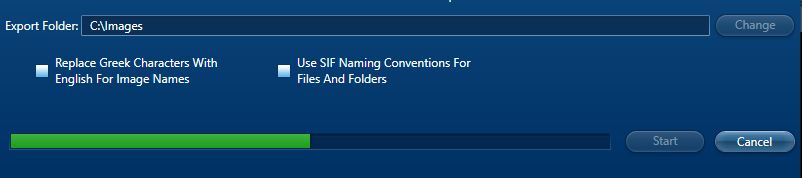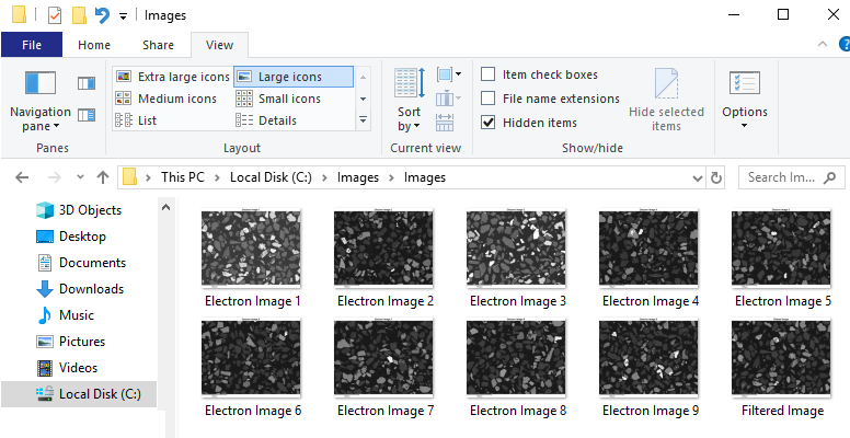 エクスポートフォルダを選択したら、スタートボタンを押して進行状況を確認します。完了すると、保存された画像の数を示すメッセージボックスが表示されます。エクスポートフォルダを見ると、選択した電子線画像がすべて表示されています。