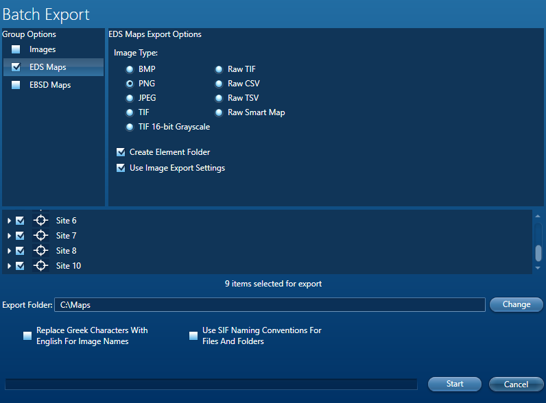 また、マップを分析領域フォルダや元素フォルダにエクスポートするかどうかも選択できます。ここでは、「PNG」と「元素フォルダの作成」オプションを選択します。次に先ほどと同様に、エクスポートする分析領域とエクスポート先を選択します。
