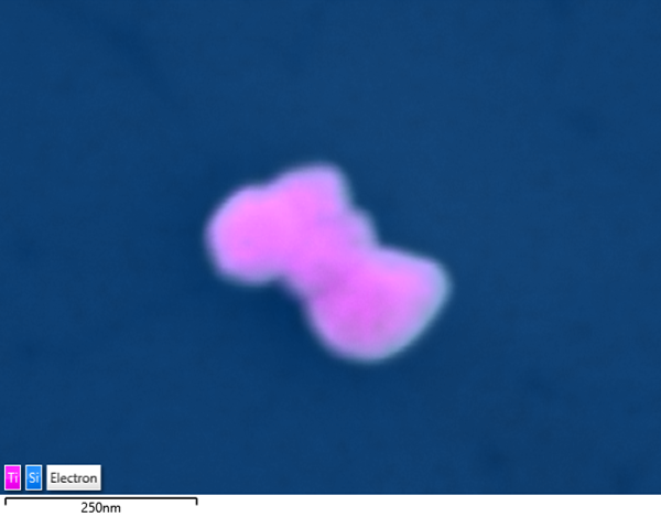 図1. Si基板上に凝集した数個のTiO2ナノ粒子のEDSマップ(食品サンプル) - 5kV, 12万倍での分析