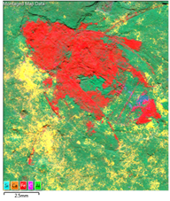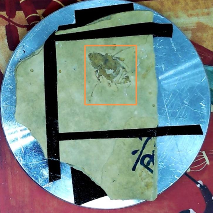 図 1 – 左側には、カブトムシの化石サンプルの写真が分析領域のオレンジ色の四角と共に示され、右側には、取得した元素マップが示されています。