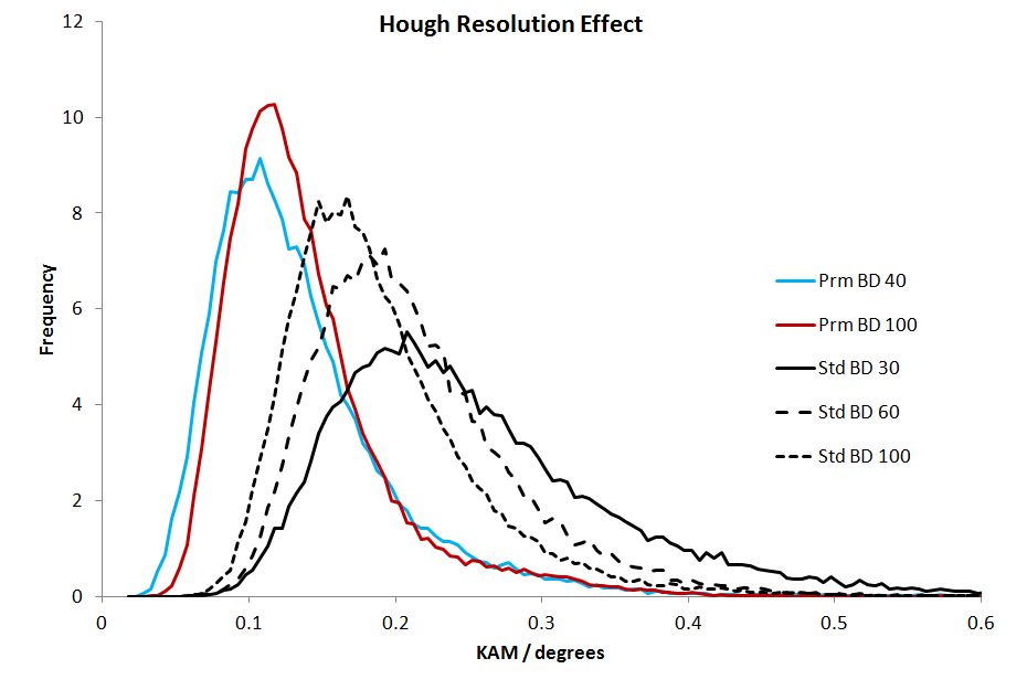 これは従来のEBSDパターン解析にも同様の利点があります。 改良されたバンドエッジ検出により、より信頼性の高いデータが得られ、ハフ変換のユーザー指定の解像度に依存しないより良い角度精度が得られます。これは次のグラフで見ることができ、異なるバンド検出設定とハフ変換の解像度に対する角度精度(Si単結晶の解析から得られたKernel Average Misorientation-KAM値を使用して測定)を示しています。