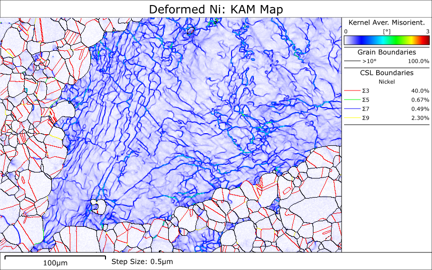 上のビデオで紹介されているデータセットを含む、正確性のリファインで得られたデータから生成される変形した粒の画像のいくつかはとても気に入っています。ここでは、正確性のリファインが単一の変形した Ni 粒子内の複雑な転位壁構造を明らかにしています。私の唯一の問題は、KAM マップとGrain Relative Orientation Deviation (GROD) マップのどちらを選ぶか決められないことです。
