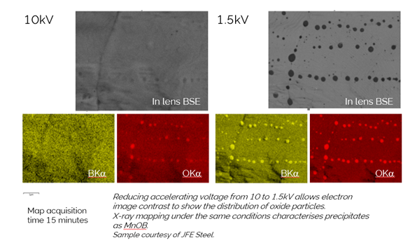 このマップは、スイートスポット分析の可能性を明確に示しています。1.5kVでは、この試料の介在物がはっきりと見えますが、従来のEDSでは10kVにすると、介在物が薄すぎて見えなくなってしまうのです。 10 kVでは、EDSはほとんど何も情報を与えません。これは、私がイメージングとEDSに関して常に言っている「電子線画像で見えないなら、EDSで特性評価を期待しないでください」という言葉を裏付けるものです。私たちの新しい分析アプローチで重要なことは、初めて1.5 kV、短いワーキングディスタンス、つまり「スイートスポット」でEDSを収集し、EDSでこれらの介在物に含まれる元素を明確に見ることができたということです。