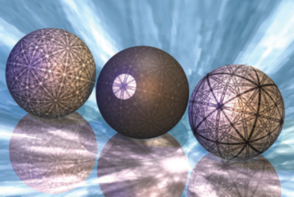球形の動的シミュレーションの例。EBSD(左の球)、CBED(右の球)、コヒーレント散乱とインコヒーレント散乱の組み合わせ(中央の球)を示す。Winkelmann, Journal of Microscopy, Vol.239, 2010, pp.32-45より引用。