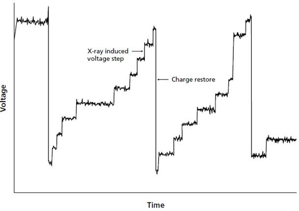 EDS検出器は、図1に示すように、X線を検出し、線形に増加する電圧ランプ上の電圧ステップに変換します。電圧信号の各ステップは、ひとつのX線検出に対応します。