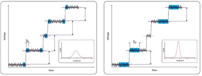 パルスプロセッサの役割は、各電圧ステップからノイズを除去し、各X線のエネルギーを正確に測定することです。50eVから40keVまでの幅広いエネルギーのX線イベントを正確に認識する必要があります。ノイズを除去するためには、電圧ステップの前後の信号をプロセスタイム(Tp)と呼ばれる一定時間内に平均化する必要があります。