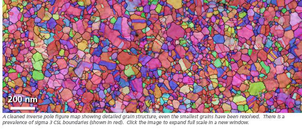 近年の技術革新にもかかわらず、従来のEBSD技術では、パターン生成領域の体積によって分解能が25-100 nm程度に制限されています。これでは、真のナノ構造材料(平均粒径が100nm以下)を正確に測定するには不十分です。