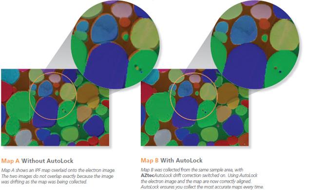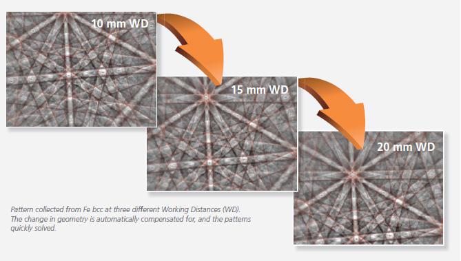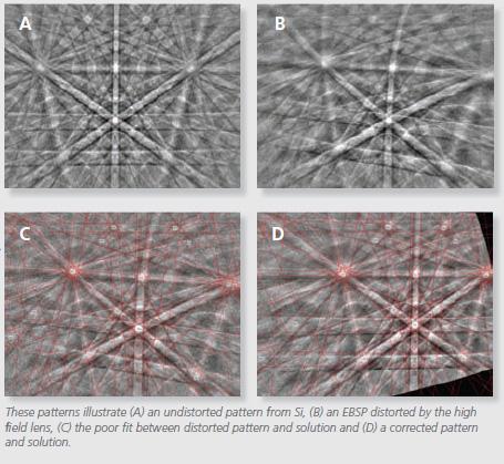 アプリケーションによっては、SEM レンズが発する高磁界によって EBSD パターンがゆがむ場合があります。このゆがみが菊池バンドをゆがめ、パターンセンターをシフトさせます。AZtec を使えばこれが自動的に修正されます。