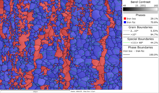 マルテンサイト構造は、従来、EBSDでの測定が困難でした。ここでは、シンメトリーが提供する高い感度と詳細なパターンにより、マルテンサイト系ステンレス鋼から優れた結果を得ることができます。